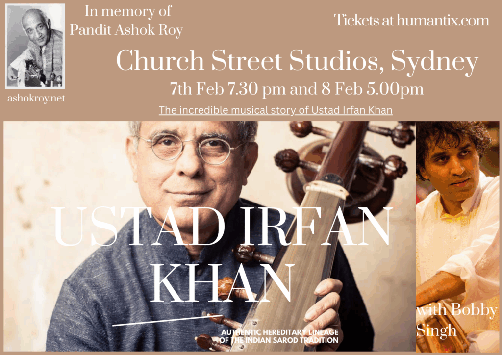 Ustad Irfan Khan of the Lucknow-Shahjahanpur Gharana will be performing for the Pandit Ashok Roy memorial concert in Feb 2026. There will be two performances at the Church Street Studios in Camperdown, Sydney on Saturday 7th Feb at 7.30pm and Sunday 8th Feb at 5.oopm.